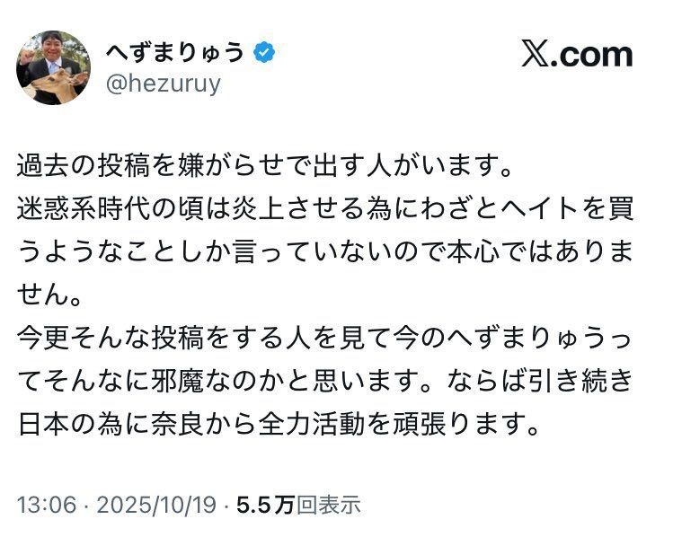 へずまりゅう「過去の僕の投稿を持ち出すのはやめてください、あれは僕の本心ではありません」