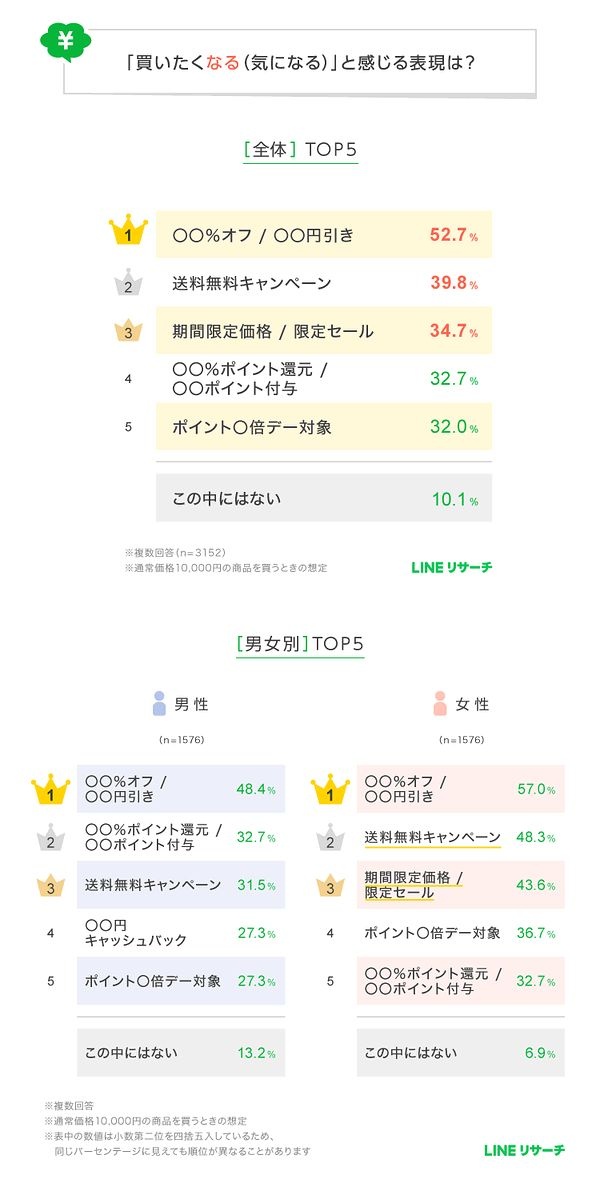 まず、「買いたくなる」と感じる表現について聞くと、全体では「○○%オフ/○○円引き」が52.7%で1位となった。2位は「送料無料キャンペーン」(39.8%)、3位は「期間限定価格/限定セール」(34.7%)と続いている。