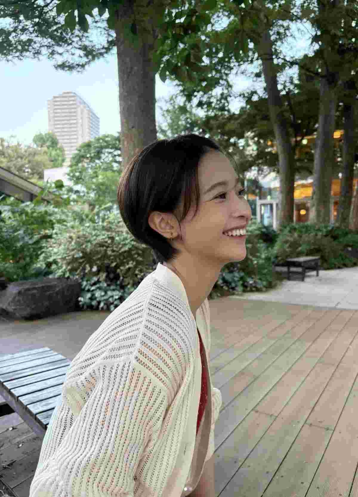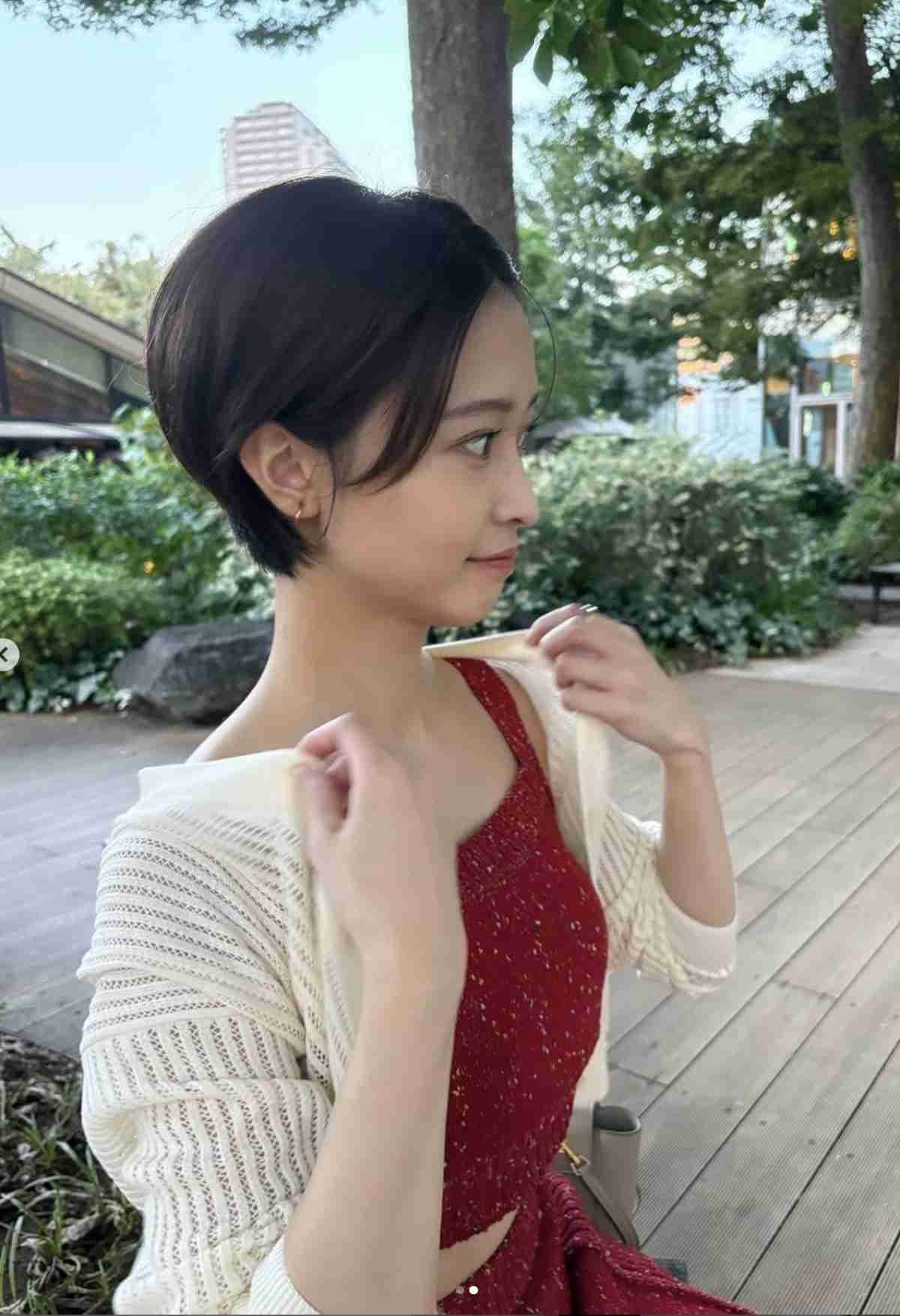 インスタグラムに投稿された写真では、シアー感のある白いカーディガンを羽織り、赤いセットアップを着用。緑の木々をバックに、笑顔をみせていた。2枚目では、カーディガンに手を添え、微笑んでいた。