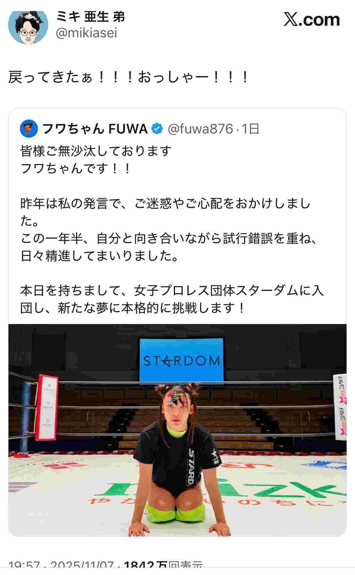 ミキ亜生「フワちゃん戻ってきたぁ!!!おっしゃー!!!」→炎上