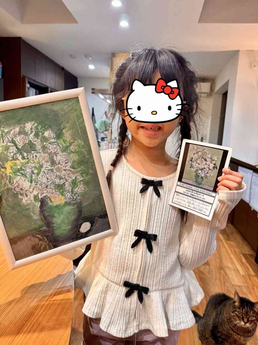 古坂さんは、小学1年生のお子さんが、お花の絵を持って笑顔を見せる写真を投稿。画家ゴッホの作品「花瓶のバラ」を模写した作品のようです。