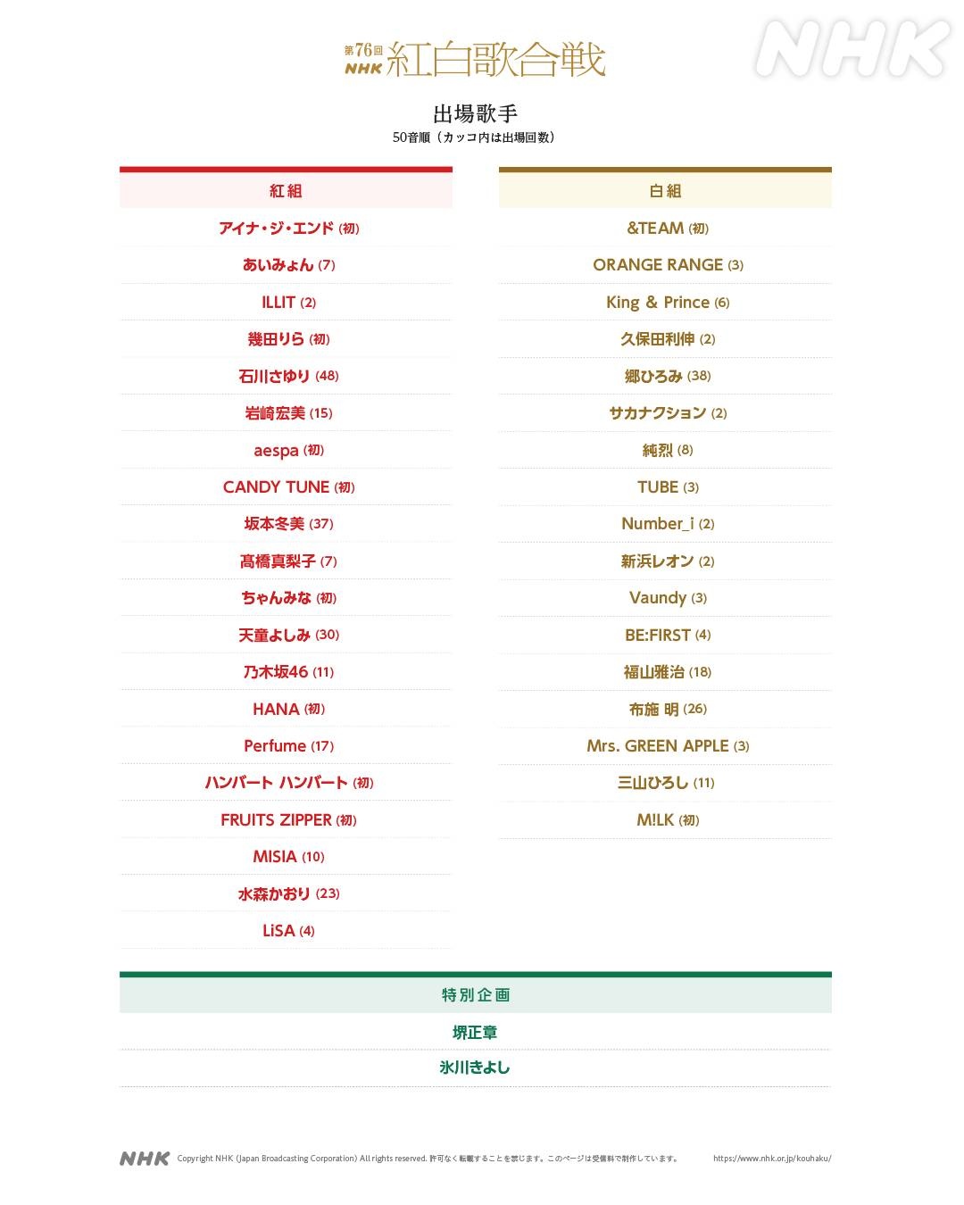 大みそか恒例の『第76回NHK紅白歌合戦』(後7:20~11:45 総合ほか)の出場歌手が14日、東京・渋谷のNHK局内で発表された。同日の記者会見には、初出場となる紅組のアイナ・ジ・エンド、幾田りら、CANDY TUNE、ちゃんみな、HANA、ハンバート ハンバート、FRUITS ZIPPER、白組の&TEAM、M!LK、特別企画の堺正章がそれぞれ意気込みを語った。