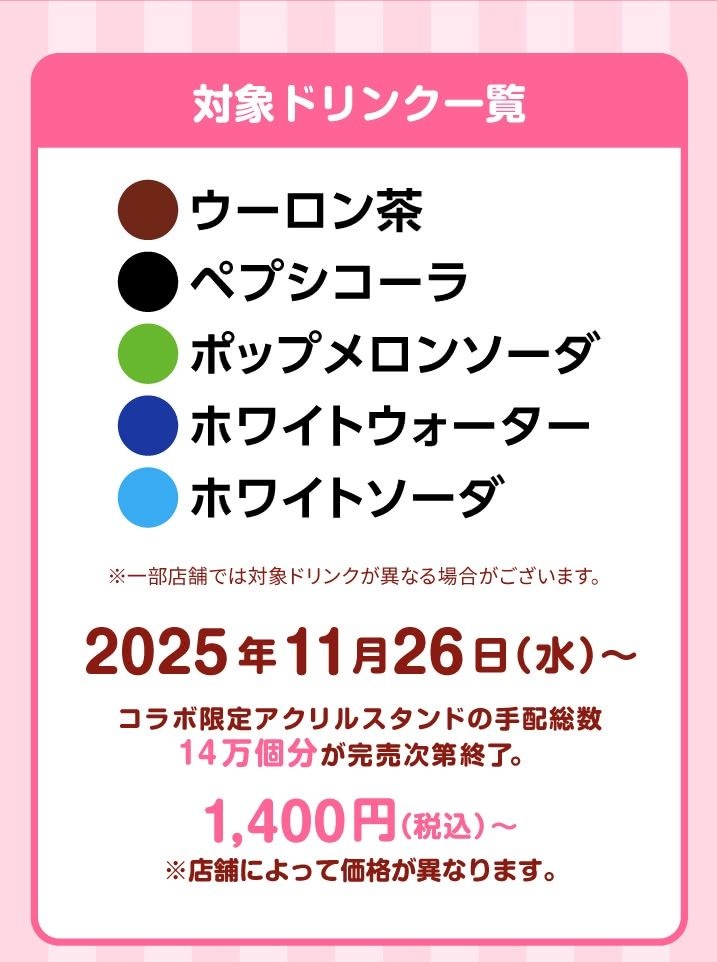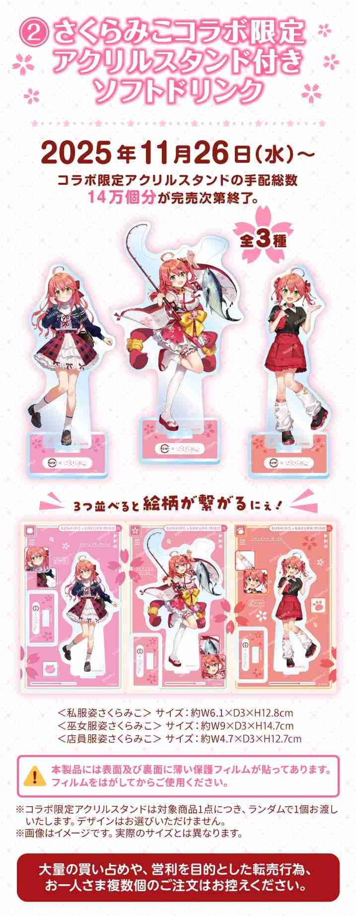 対象のドリンクはウーロン茶、ペプシコーラ、ポップメロンソーダ、ホワイトウォーター、ホワイトソーダ。アクリルスタンドはさくらみこさんがそれぞれ通常衣装、私服、スシローの制服を着用したコラボビジュアルを用いた3種のうち、1種がランダムで付属する。販売は手配総数14万個分が完売次第終了となる。