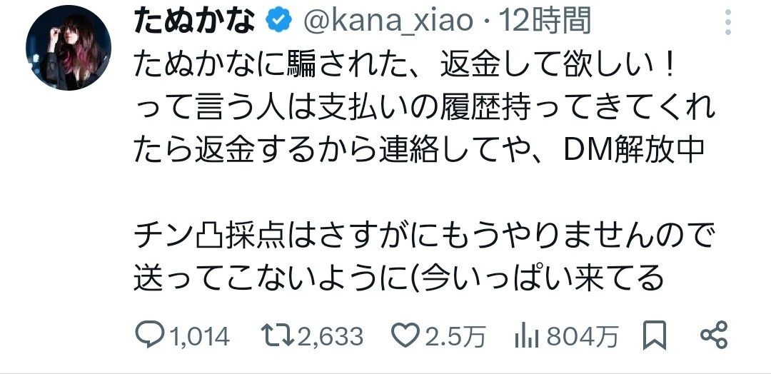 チン凸に関してはたぬかなは女神対応してる。女のインフルエンサーなんてほぼ全員チン凸されてるけど通報するかフル無視で終わるのにたぬかなは無料でチン凸採点していた