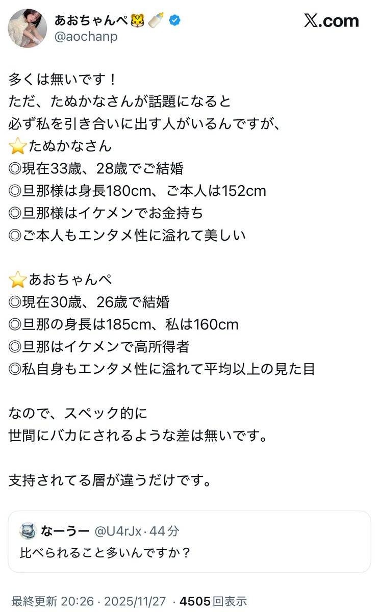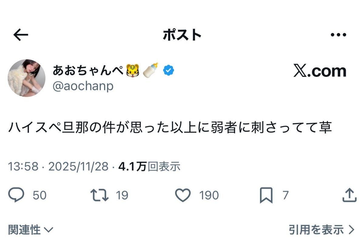 あおちゃんぺ「ハイスペ旦那の件が思った以上に弱者に刺さってて草」と罵倒する←今ここ