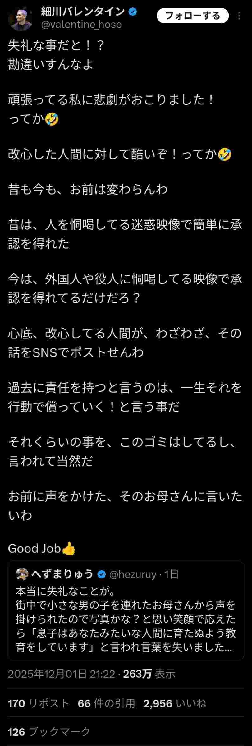 https://x.com/valentine_hoso/status/1995468523011994108x.com米山隆一氏、細川バレンタイン氏へ法的措置検討「国旗損壊罪」の解釈巡る自身へのポストで