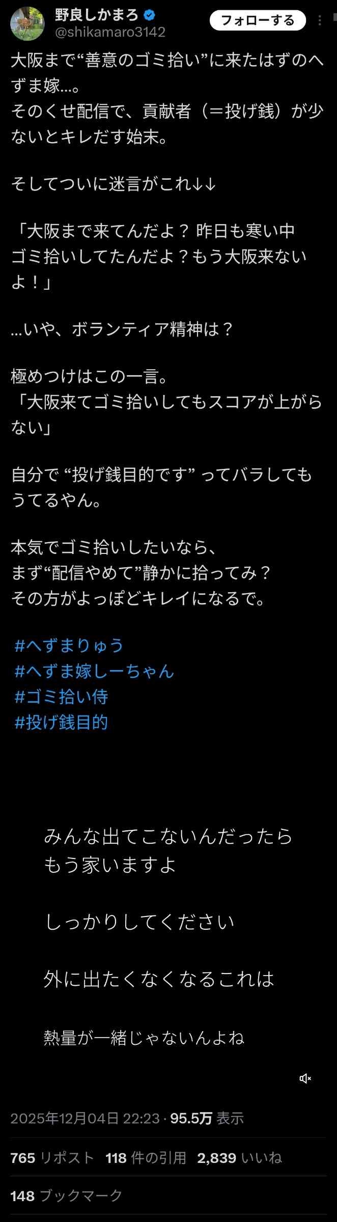 ボランティアなのに投げ銭少ないとキレるとか、さすがに慈善活動の概念が歪んでる気がするね
