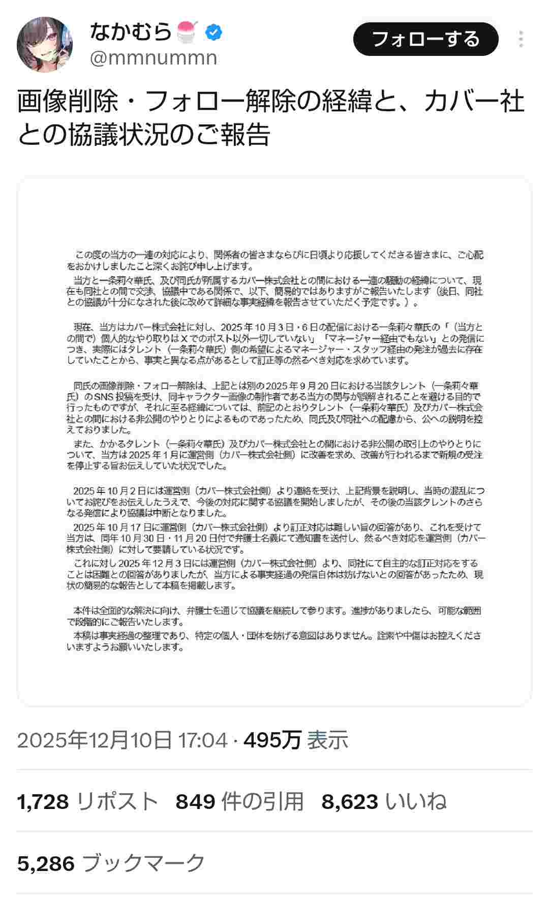 ​一条莉々華氏の配信での発言(マネージャー経由の発注はなかった等)は事実と異なるとして、所属のカバー株式会社に対し訂正を求めています。