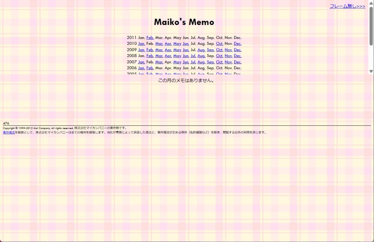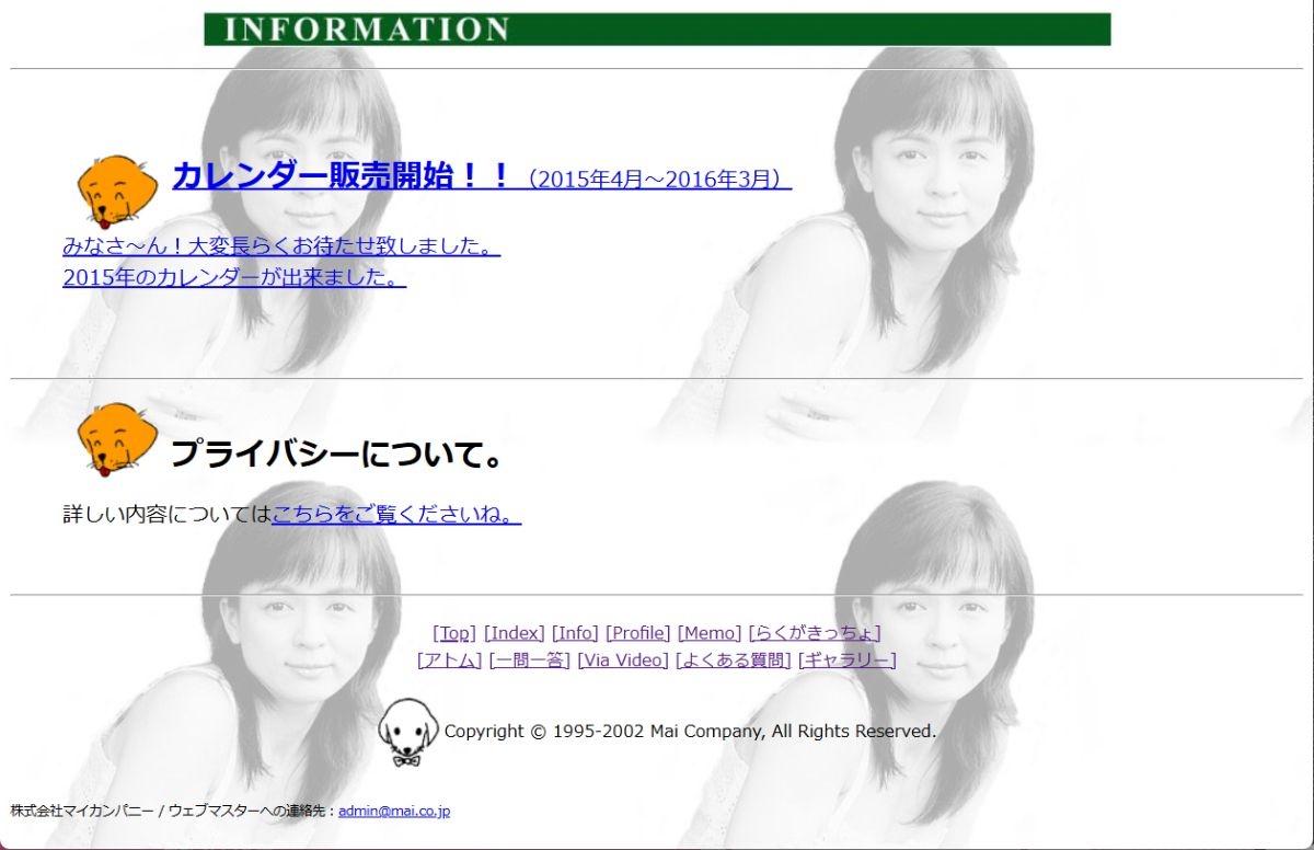 コンテンツはインフォメーションやプロフィール、愛犬アトムの紹介やスケジュールなど。インフォメーションページや「Maiko’s Memo」ページの壁紙や各所に使われたフレームがインターネットが平和だったあの頃を思い出させてくれます。