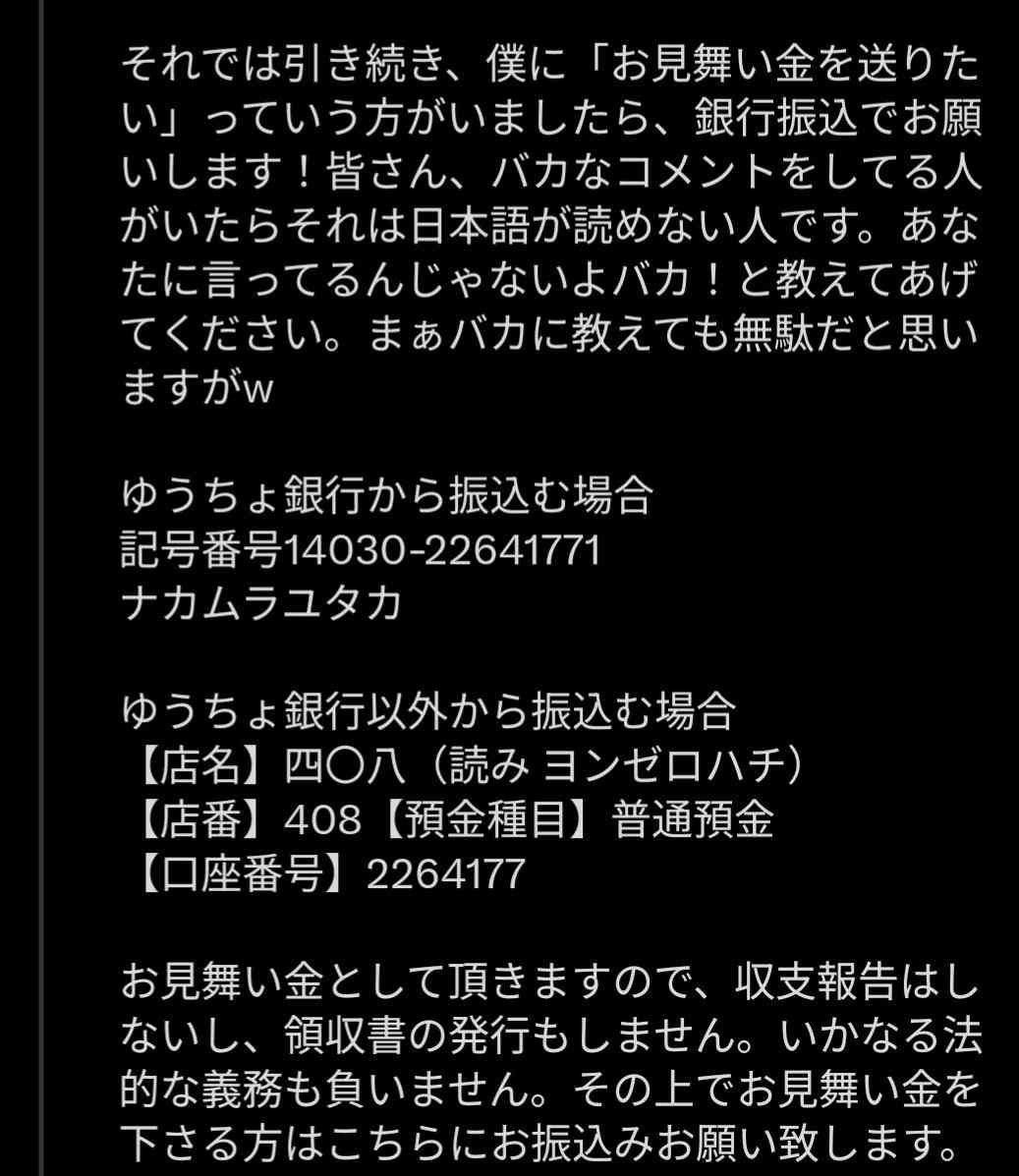 それでは引き続き、僕に「お見舞い金を送りたい」っていう方がいましたら、銀行振込でお願いします!皆さん、バカなコメントをしてる人がいたらそれは日本語が読めない人です。あなたに言ってるんじゃないよバカ!と教えてあげてください。まぁバカに教えても無駄だと思いますがw