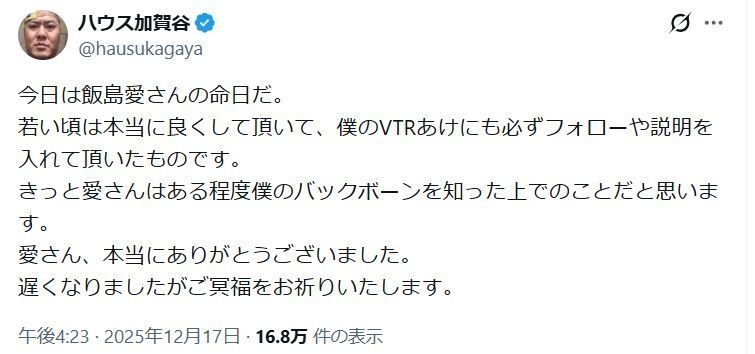 お笑いコンビ「松本ハウス」のハウス加賀谷(51)が21日までにX(旧ツイッター)を更新。2008年に36歳で亡くなったタレント飯島愛さんの命日を迎え、追悼した。