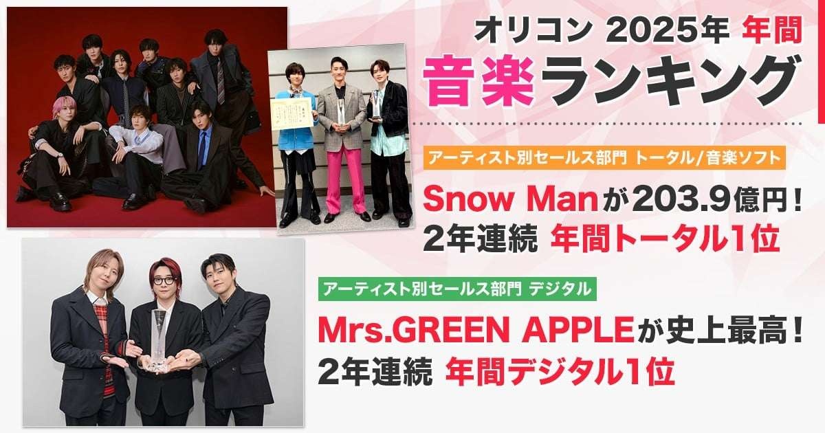 売上金額(億円):44.12025年の年間音楽セールスの動向をまとめた『第58回 オリコン年間ランキング2025』が発表された。音楽ソフト(シングル、アルバム、ミュージックDVD・Blu-ray Disc/以下BD)とデジタル作品(デジタルシングル(単曲)、デジタルアルバム、ストリーミング)の総売上金額を集計した「アーティスト別セールス部門」の「トータルランキング」では、期間内売上203.9億円を記録したSnow Manが、2年連続で1位を獲得したほか、同「音楽ソフトランキング」でも1位となった。また、同「デジタルランキング」では、Mrs. GREEN APPLEが2年連続1位獲得となった。