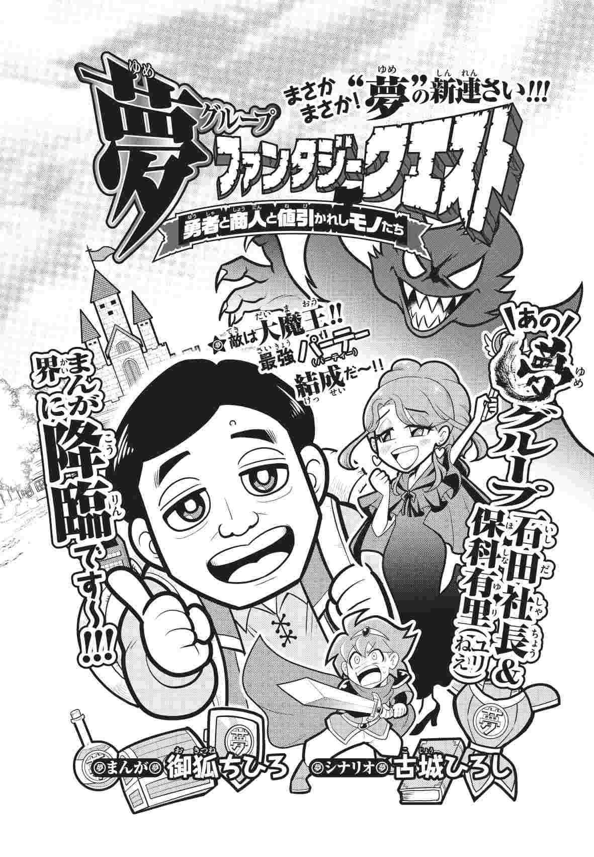 石田重廣社長と保科有里のコンビによる通販番組で知られる夢グループ。通信販売のほかにもコンサートの運営などを行い、2人はステージに立つなど歌手としても活動している。マンガのタイトルは「夢グループファンタジークエスト 勇者と商人と値引かれしモノたち」。大冒険ストーリーにイシダ社長が商人として、ユリねえが魔法使いとして登場するギャグマンガだ。シナリオは古城ひろしが担当し、マンガは御狐ちひろが手がける。また今号には夢グループのステッカーが封入された。