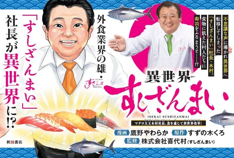 すしざんまいの社長である木村清は、ある日不思議な声に導かれ、異世界へ転移してしまう。空腹の村人たちのために寿司を振る舞うと、木村は一躍ときの人に。村を襲う海賊たち、そして万年食糧不足の村を前に、木村が挑むのは……。原作はすずの木くろ、監修は喜代村(すしざんまい)、マンガは鷹野やわらかが手がけている。作品は月刊ミステリーボニータ(秋田書店)で連載中。