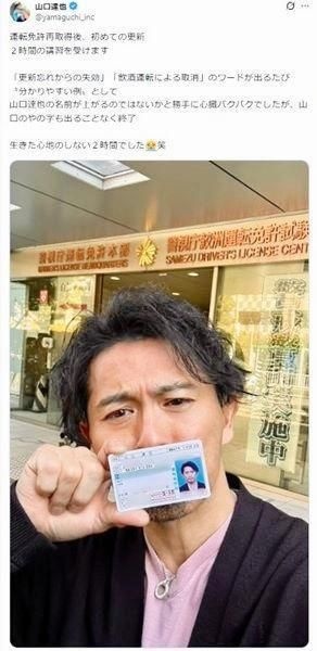 「運転免許再取得後、初めての更新 2時間の講習を受けます」「『更新忘れからの失効』『飲酒運転による取消』のワードが出るたび “分かりやすい例”として 山口達也の名前が上がるのではないかと勝手に心臓バクバクでしたが、山口のやの字も出ることなく終了 生きた心地のしない2時間でした 笑」と自虐まじりに投稿した。