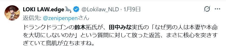 “男の人ってなんで本妻とか本命の彼女を大事にしないんですか?”って私が聞いたら」鈴木は「ちゃんと大事にする人、もっと言えば“なんで男性は浮気するんですか?”って