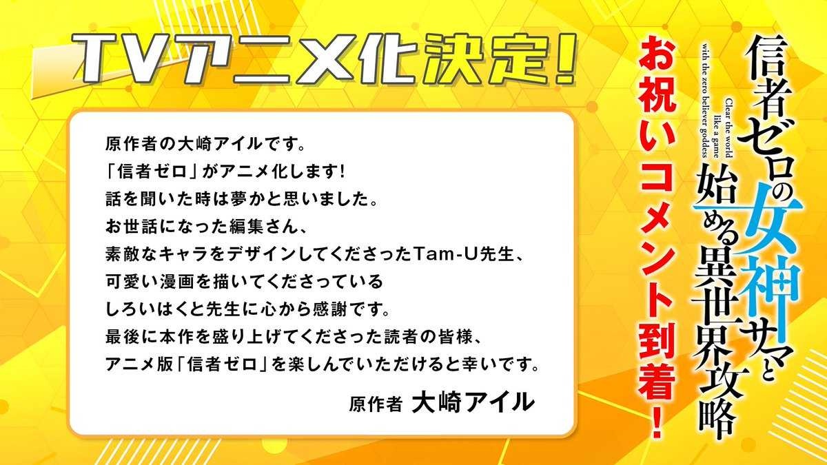 大崎さんは「『信者ゼロ』がアニメ化します! 話を聞いた時は夢かと思いました。お世話になった編集さん、すてきなキャラをデザインしてくださったTam-U先生、可愛いマンガを描いてくださっている、しろいはくと先生に心から感謝です。最後に本作を盛り上げてくださった読者の皆様、アニメ版『信者ゼロ』を楽しんでいただけると幸いです」とコメントを寄せている。