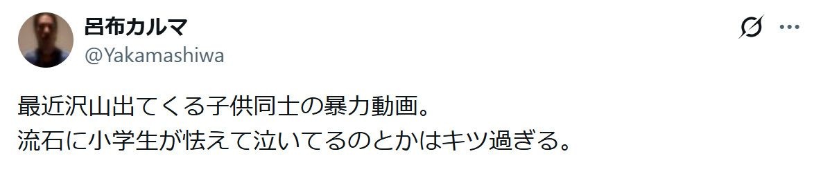 こうした状況を受けてか、呂布は「最近沢山出てくる子供同士の暴力動画。流石に小学生が怯えて泣いてるのとかはキツ過ぎる」と述べた。