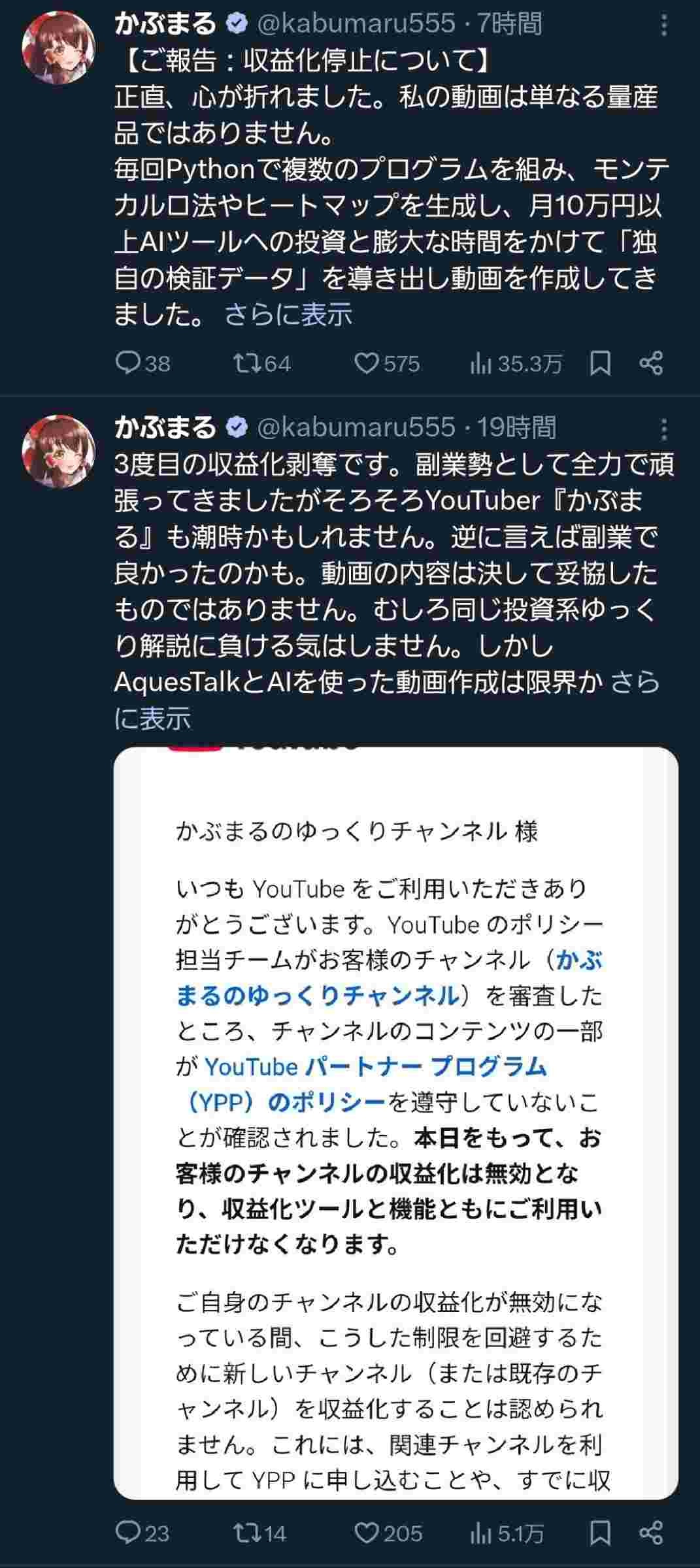 ゆっくり解説YouTuber、突然収益化を剥奪されて心が折れる「もう引退します」
