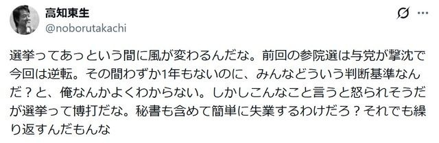 高知は「選挙ってあっという間に風が変わるんだな」と切り出し、「前回の参院選は与党が撃沈で今回は逆転。その間わずか1年もないのに、みんなどういう判断基準なんだ?と、俺なんかよくわからない」と述べた。そして「しかしこんなこと言うと怒られそうだが選挙って博打だな。秘書も含めて簡単に失業するわけだろ?それでも繰り返すんだもんな」と続けた。