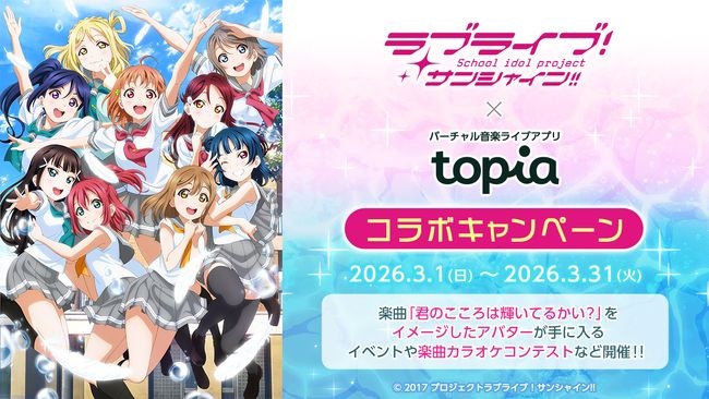 (プレスリリース)「ラブライブ!サンシャイン!!」とバーチャル音楽ライブ配信アプリ「topia」がコラボ!楽曲「君のこころは輝いてるかい?」をイメージしたアバターが獲得できるイベントや歌唱コンテストなどを開催!
