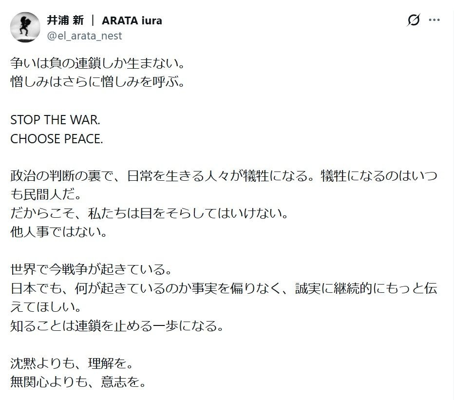 井浦はこうした状況をうけてか「争いは負の連鎖しか生まない。憎しみはさらに憎しみを呼ぶ。STOP THE WAR. CHOOSE PEACE.」と英文も交え、書き出した。