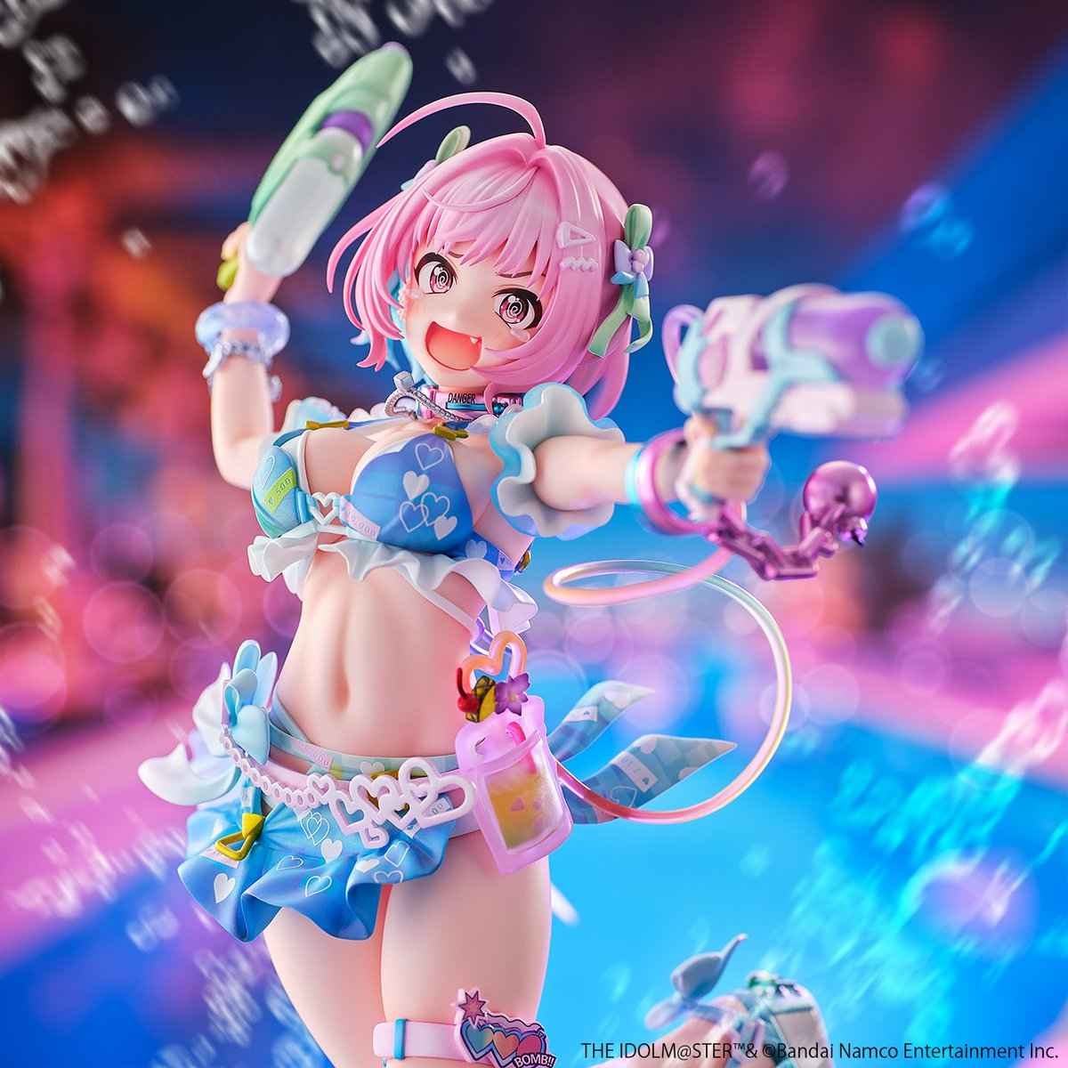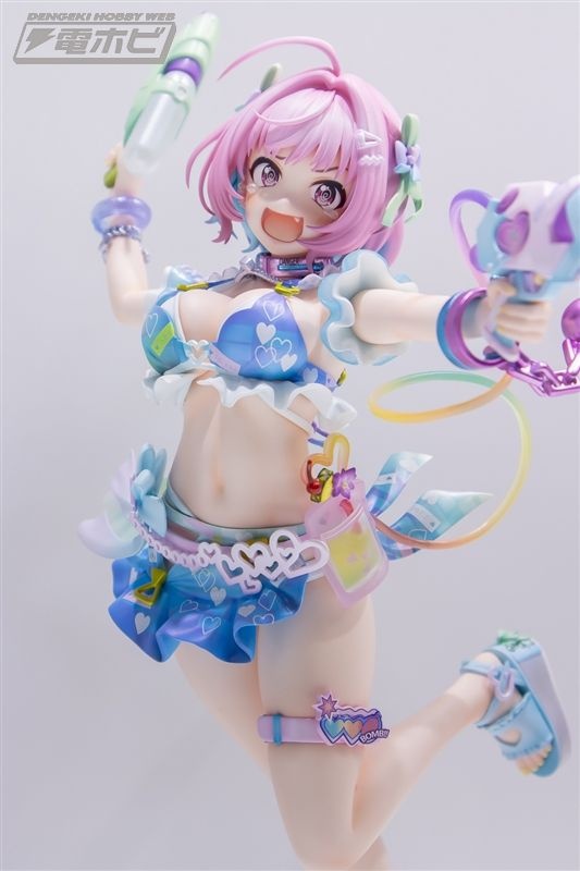 水着姿のりあむを忠実に再現。ボディラインは魅力たっぷりに、たくさんの小物も精度高く造形されています。また、りあむの特徴的なピンク頭とインナーカラーの水色、クリア素材の鞄、スマホやジュース、細かなアクセやネイルなどカラフルな色合いにも注目!