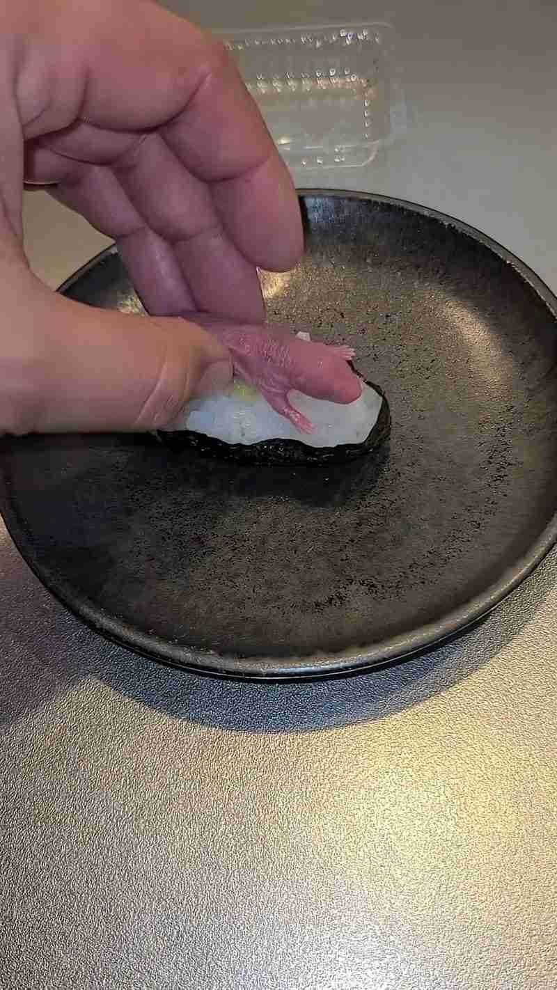 飯島は酢飯を握り、海苔を巻いて軍艦状に仕立てると、わさびを添えた上に赤ちゃんネズミを乗せ、醤油をつけて一口で頬張りました。最後には親指を立てるポーズで締めくくっています。