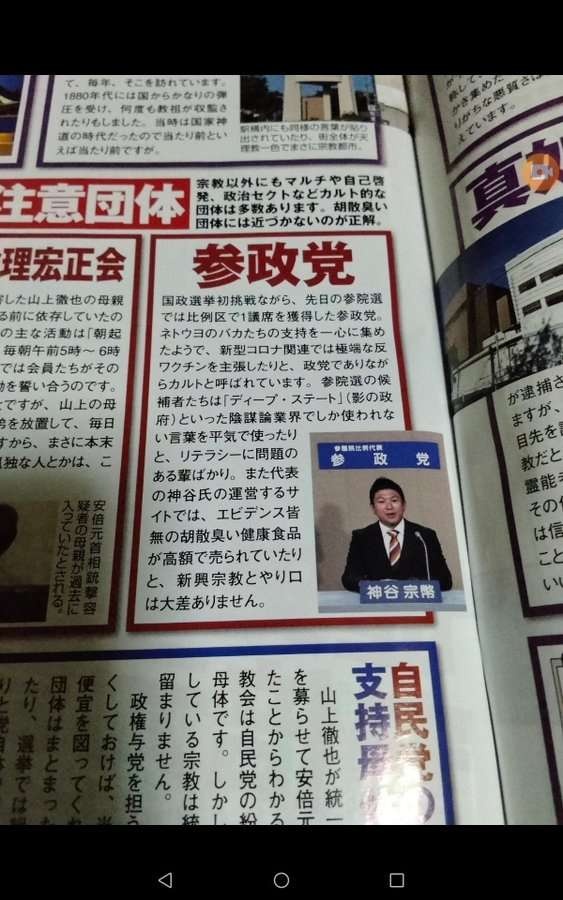 週刊誌「参政党は党首が胡散臭い高額健康食品を売っている。新興宗教と大差無い」