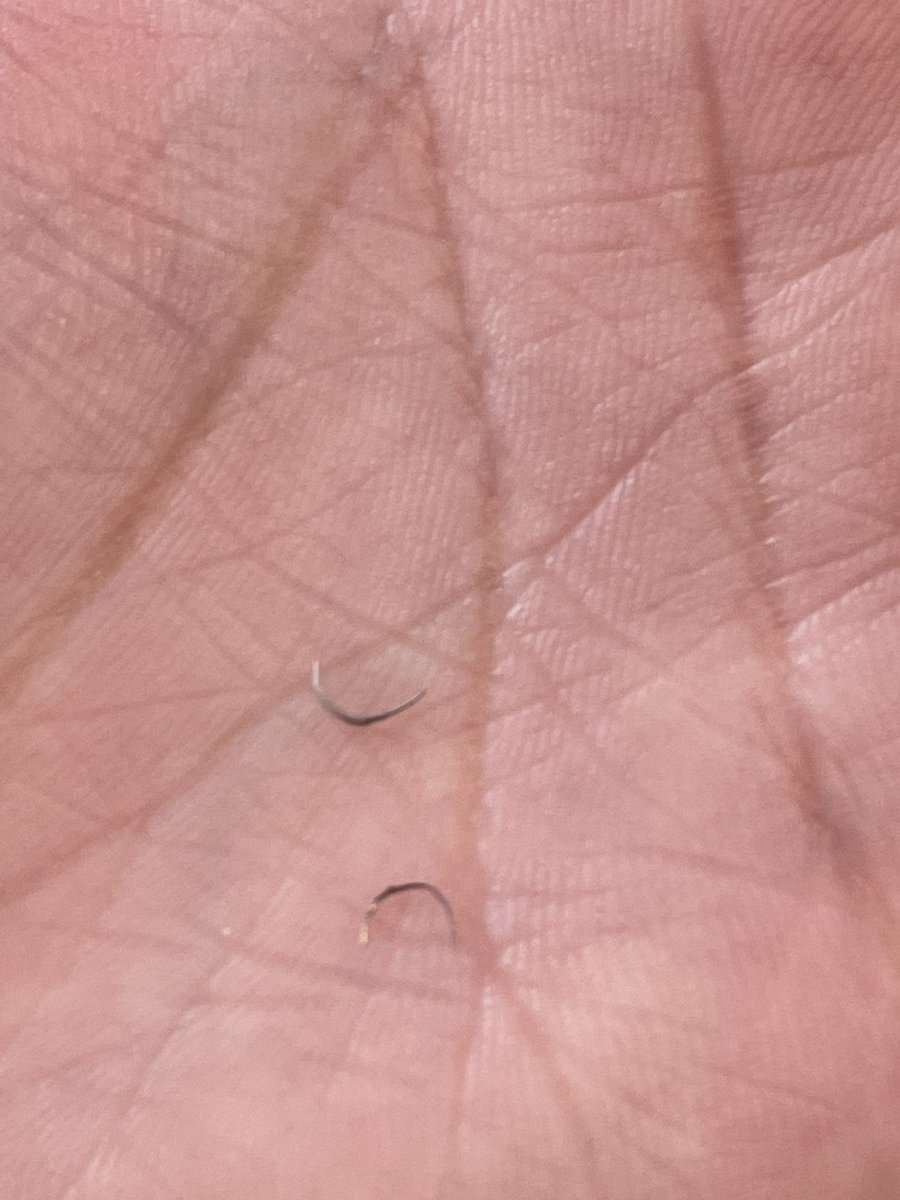 2枚目は、手のひらの上に、小さく細長い湾曲した金属片のように見える物を2つ置いた様子だ。