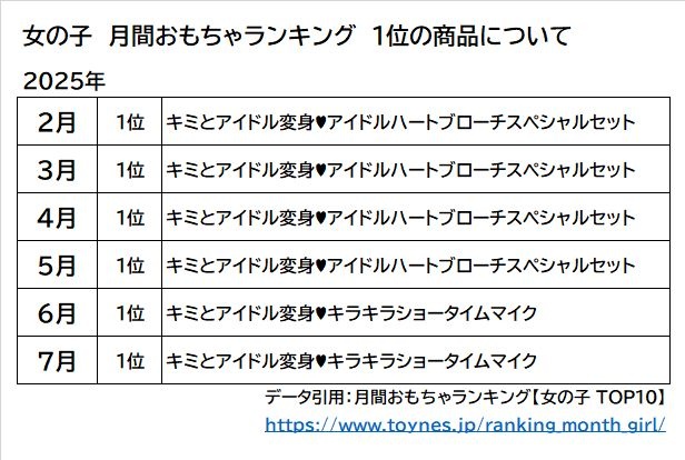 実際、作中での変身アイテムであり主力玩具の「キミとアイドル変身 アイドルハートブローチ」は、東京玩具人形協同組合が発表している「女の子玩具の売上月間ランキング」で発売から4カ月連続で1位を獲得。6~7月は追加キュア、キュアズキューンとキュアキッスのアイテム「キミとアイドル変身 キラキラショータイムマイク」が2カ月連続1位を獲得するなど、玩具面でも好調となっています。